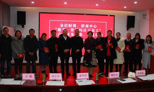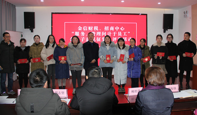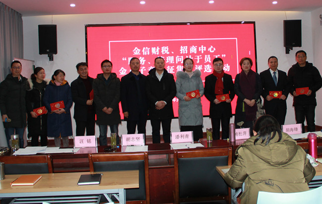 1月18日,招商中心、金信財稅召開“金點子”評選大會,并專門聘請縣經(jīng)濟開發(fā)區(qū)副主任潘利青、縣投資促進局副局長鮑杜萍、縣科技商務(wù)經(jīng)濟信息化局副局長胡志堅等三位領(lǐng)導作為評委參與評選,金信財稅全體員工50余人參加了大會。