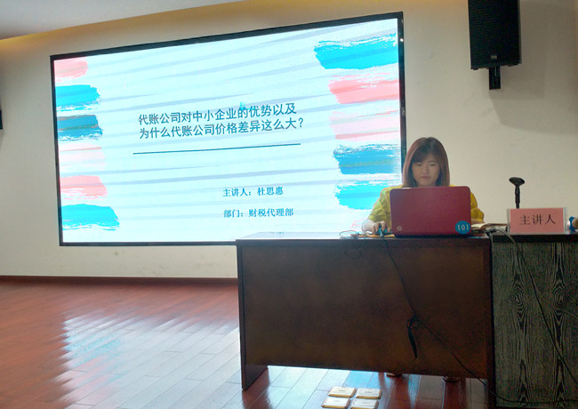 杜思惠轉(zhuǎn)正時(shí)間不長(zhǎng),但她工作努力、學(xué)習(xí)認(rèn)真,已經(jīng)成為部門經(jīng)理的得力助手。當(dāng)日,她結(jié)合日常學(xué)習(xí)到的點(diǎn)滴,以權(quán)敢勞務(wù)公司財(cái)稅代理簽約入題,從注冊(cè)公司找代理記賬公司代辦的好處,代理記賬公司對(duì)中小企業(yè)的優(yōu)勢(shì),代記賬公司的價(jià)格差異為什么這么大等三個(gè)方面展開闡述,使參訓(xùn)人員受益良多。中心副主任汪銘進(jìn)行了點(diǎn)評(píng),他肯定了杜思惠的選題和內(nèi)容組織,號(hào)召大家善于從日常工作、學(xué)習(xí)中積累素材,為PPT分享做好準(zhǔn)備,不斷提升中心的對(duì)外服務(wù)水平。