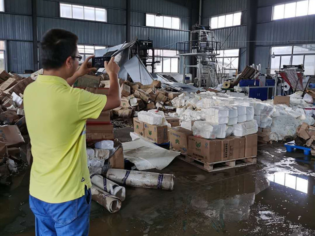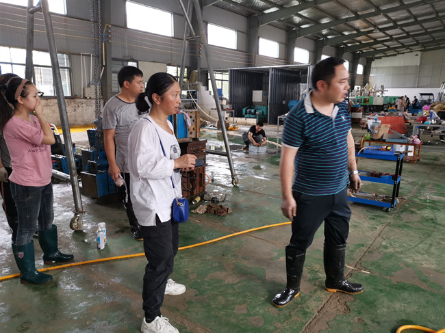 (上圖為公司會(huì)計(jì)柯淼在嘉達(dá)塑膠公司車間了解受災(zāi)情況。)