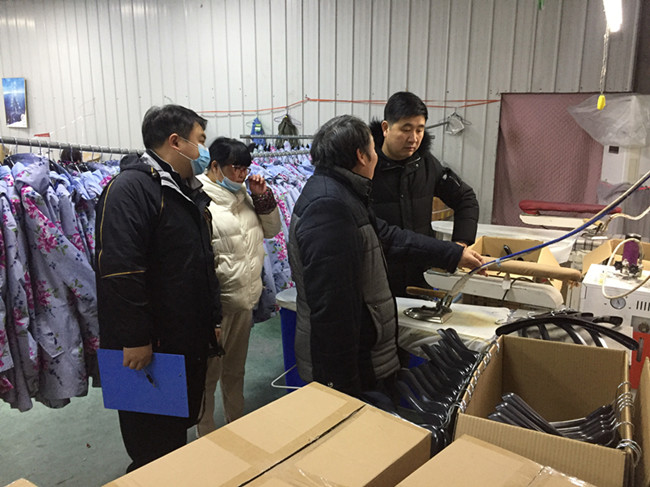 (上圖為富堨鎮(zhèn)政府副鎮(zhèn)長朱超(中)帶隊在華邦公司車間檢查。)