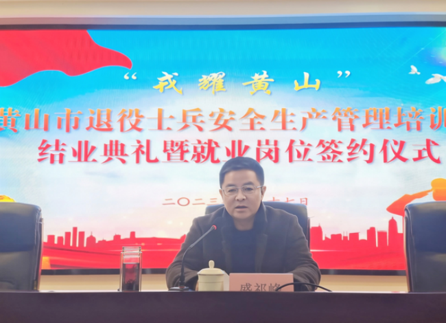 2月17日,“戎耀黃山”黃山市退役士兵安全生產(chǎn)管理培訓班結(jié)業(yè)典禮暨就業(yè)崗位簽約儀式在歙縣青創(chuàng)職業(yè)培訓學校舉辦。黃山市退役軍人事務局黨組書記、局長盛祁峰出席并講話,副局長朱樂華主持,歙縣應急管理局和各區(qū)縣退役軍人事務局領(lǐng)導參加活動。