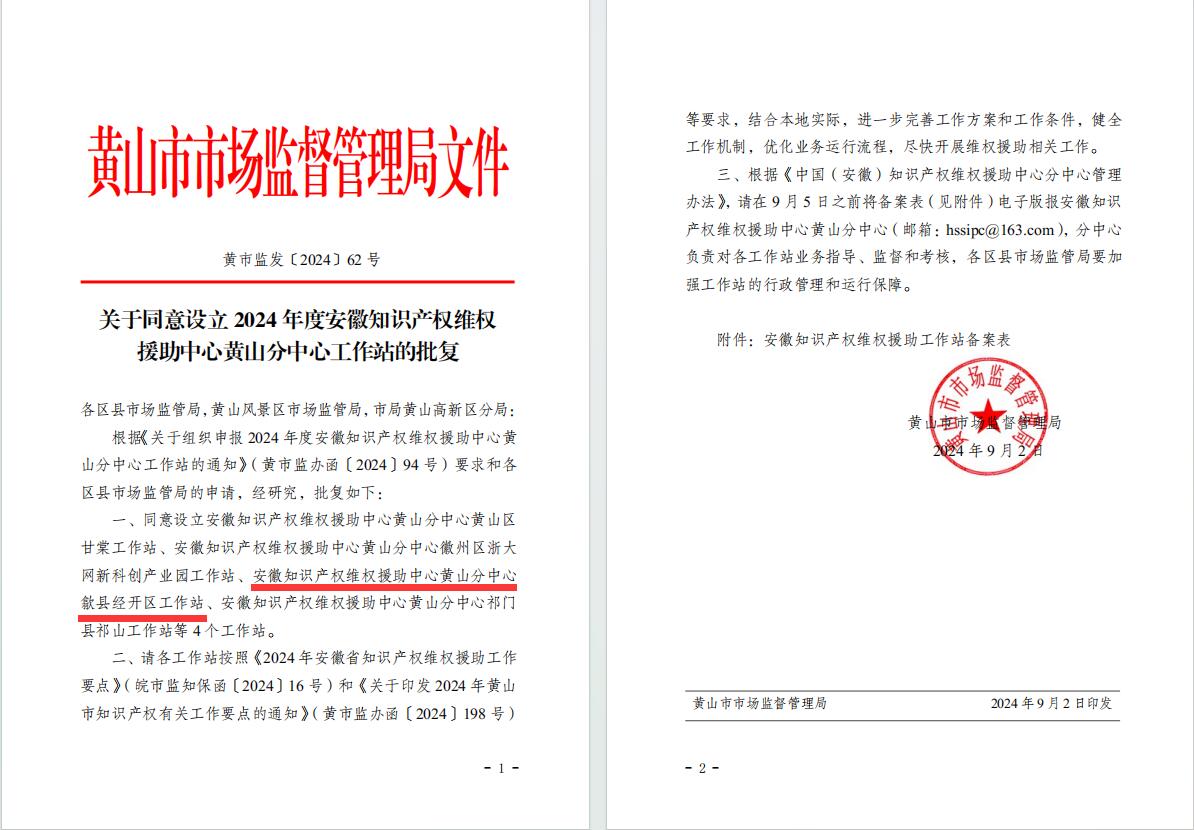 9月2日,黃山市市場監(jiān)督管理局正式批復(fù),批準安徽香寧眾創(chuàng)科技服務(wù)有限公司成立安徽知識產(chǎn)權(quán)維權(quán)援助中心黃山分中心歙縣經(jīng)開區(qū)工作站。